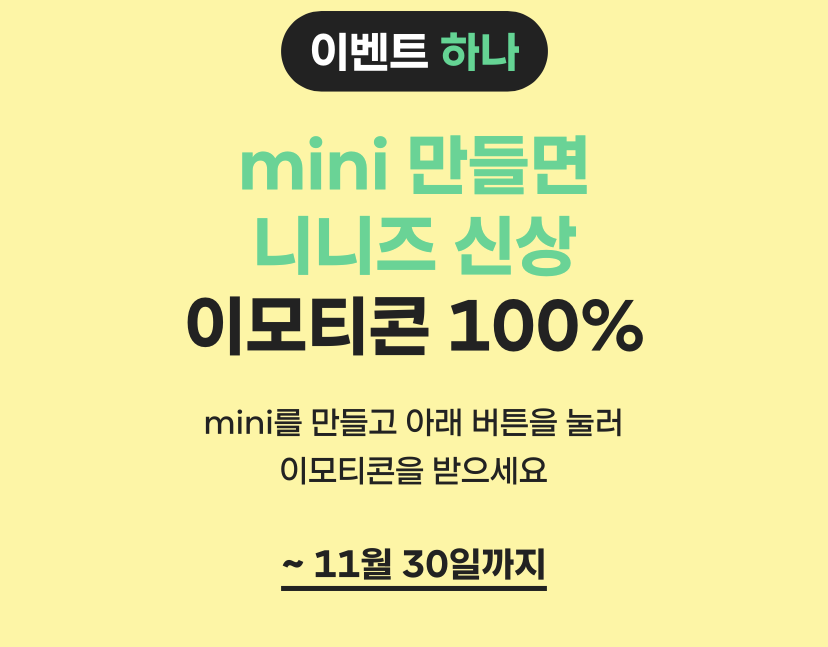 11/30 까지 미니카드를 만들면 니니즈 이모티콘을 100% 받을 수 있습니다.