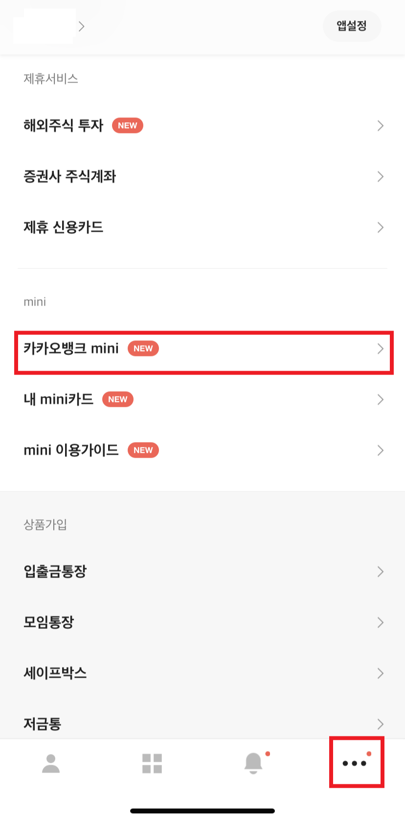 하단에보이는 쩜쩜쩜 버튼을 눌러주시고 '카카오뱅크 mini'를 눌러줍니다.